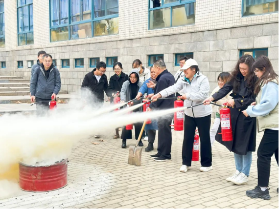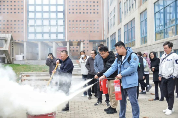 在灭火演练中,保卫处老师详细介绍了灭火器的使用方法、适用范围、灭火原理等消防知识,并通过演示让师生了解如何正确操作灭火器以及如何才能在紧急情况下迅速疏散等。