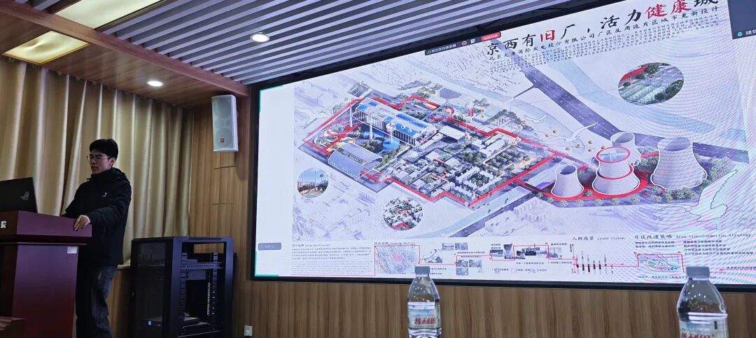 两组作品进行了成果展示和深入交流。《京西有旧厂,活力健康城》(指导教师:吴艳珊、陈中高,学生:卜小凡、曲璐、王鹏、刘帛翰、李其瑞)旨在以“工业遗产复兴+全民健康运动”为核心策略,依托“冬奥社区”,探索旧工业区向复合型公共活力片区的城市更新模式。《康廊织脉,万象更芯》(指导教师:张哲浩、张巍,学生:张心悦、吕萌、杨玟诗、贾彦淋、王雅霖)聚焦大唐电厂片区工业遗产更新,通过康养功能植入、廊桥系统织补与工业记忆活化的多维策略,实现片区从工业遗址到复合型活力社区的蜕变。