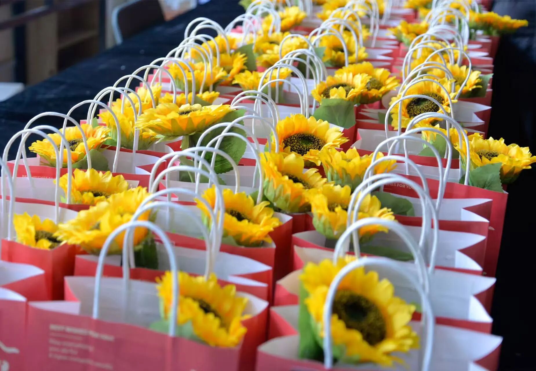 礼包里面不仅有考试用品套装助力学子从容应考、暖宝宝驱散冬日寒意、士力架补充满满能量,还有手作向日葵承载着888集团