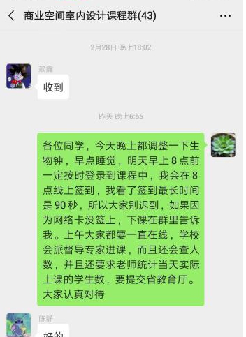 组织的信息化技能培训课程,去了解自己不太熟悉的直播课软件。另外也提前让学生做好学习的准备,先建立了课程的微信群,把所以学生都拉进群,通知他们课程学习方式,让他们准备好上课用的智能手机、平板、电脑等,并下载相关软件。经过一个周紧锣密鼓地准备,在开始直播之前进行了线上测试,确保每一个学生能够看。制定这些计划,确保线上教学顺利开展。