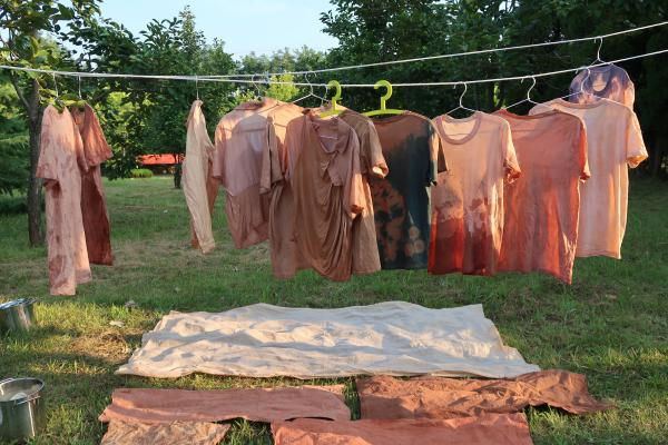 进行深度的理论学习,在扎染课程学习中掌握了基本的技法,对植物染色有了初步的了解,课下在专业老师的带领下开展了非遗柿染实践活动。团队成员对柿染技术进行多次实验,对柿汁的提取、染色步骤、媒染方法等工艺进行了深入的实践探索,并开发了一系列的柿染产品,如包包、饰品、服装等,并通过各大平台进行销售,取得了初步的成果。目前已发表论文《扎染艺术的跨界与延伸设计探究》,撰写了《丰衣足“柿”—沂蒙山区柿染工艺发掘与创意产品开发研究》调研报告,在第七届互联网+大学生创新创业大赛中获省级银奖,第十三届挑战杯创新创业大赛获省级银奖。