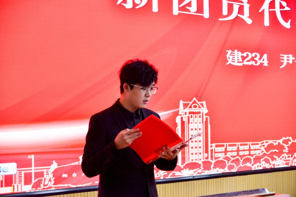 尹长浩同学代表全体新发展团员向团组织表达心声:要以信仰之名,许下青春誓言,以更加饱满的热情,更加坚定的信念,响应时代号召,为实现中华民族伟大复兴的中国梦贡献青春力量!